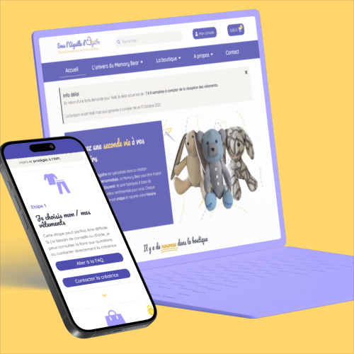 Chaque création racontant une histoire, j’ai repensé la page galerie selon une logique visuelle simple et poétique : avant/après reliés par une aiguille, symbole du geste d’Agathe. Ce détail graphique incarne le passage du tissu au souvenir.